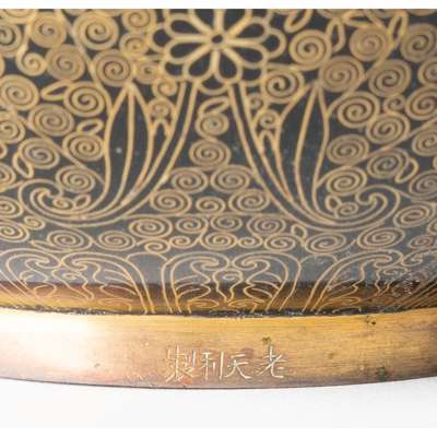 the squatted globular body supported on a short foot and terminating to a straight neck, decorated overall with floral pattern against a black ground, the side of the foot ring carved with a four-character 'Lao Tian Li Zhi' mark