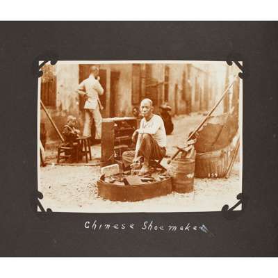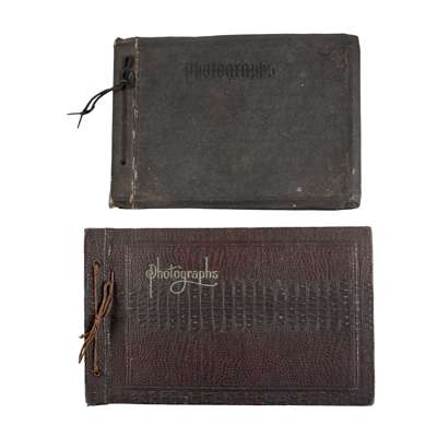 one album containing 130 photographs, the other containing 124, both leather bound, some pages with a handwritten description of the scene and various activities in Asia, including H.M.S Hermes the conventional British aircraft carrier docked in Hong Kong harbour, views from the Peak, views of Hong Kong University, Hong Kong type sampan wedding and rickshaw, British marines sightseeing in Hong Kong, views at British North Borneo, British Wei-hai-wei, and old postcards of night scene in Nanking Road, Shanghai, Penang Hill Railway etc. (2)