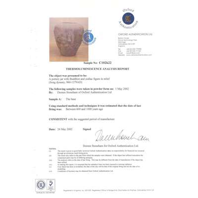 The result of the Oxford Authentication Ltd. thermoluminescence analysis test, sample no. C102k22, is consistent with the dating of this lot, with an original certificate dated 24 May 2002.