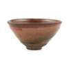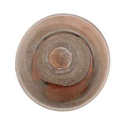 the steep sides covered inside and out with a thick black glaze finely streaked with brown “hare's fur” markings, the glaze pooling in an uneven line above the foot to reveal the buff ware