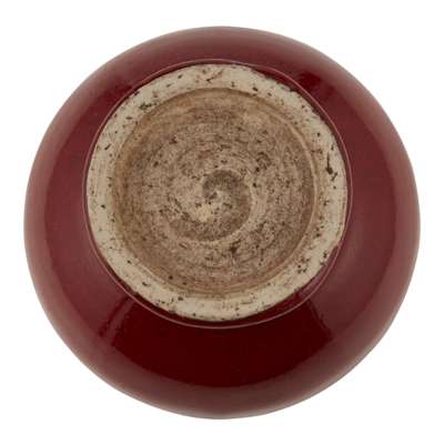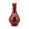 of bottle form, moulded with a chilong across the shoulders, covered in red glaze thinning underneath the mouth rim and on the dragon revealing the white body