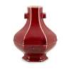 the six-sided vessel rising from a flared foot to a wide body and waisted neck, the neck flanked by a pair of tubular lug handles, covered overall in a copper-red glaze, the base inscribed with a six-character Qianlong mark in underglaze blue