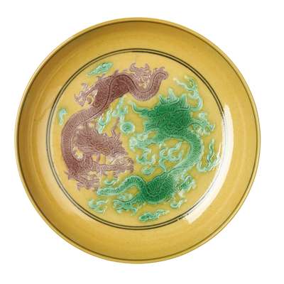YELLOW-GROUND GREEN-AND-AUBERGINE-ENAMELLED 'DRAGON' DISH