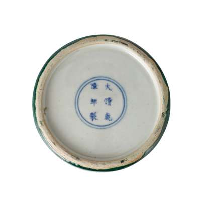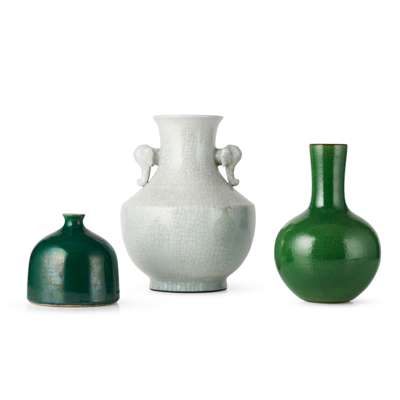 comprising: a ge-type crackle-glazed elephant-handled vase; a green-glazed bottle vase; and a green-glazed water container, the base inscribed with a six character Qianlong mark (3)