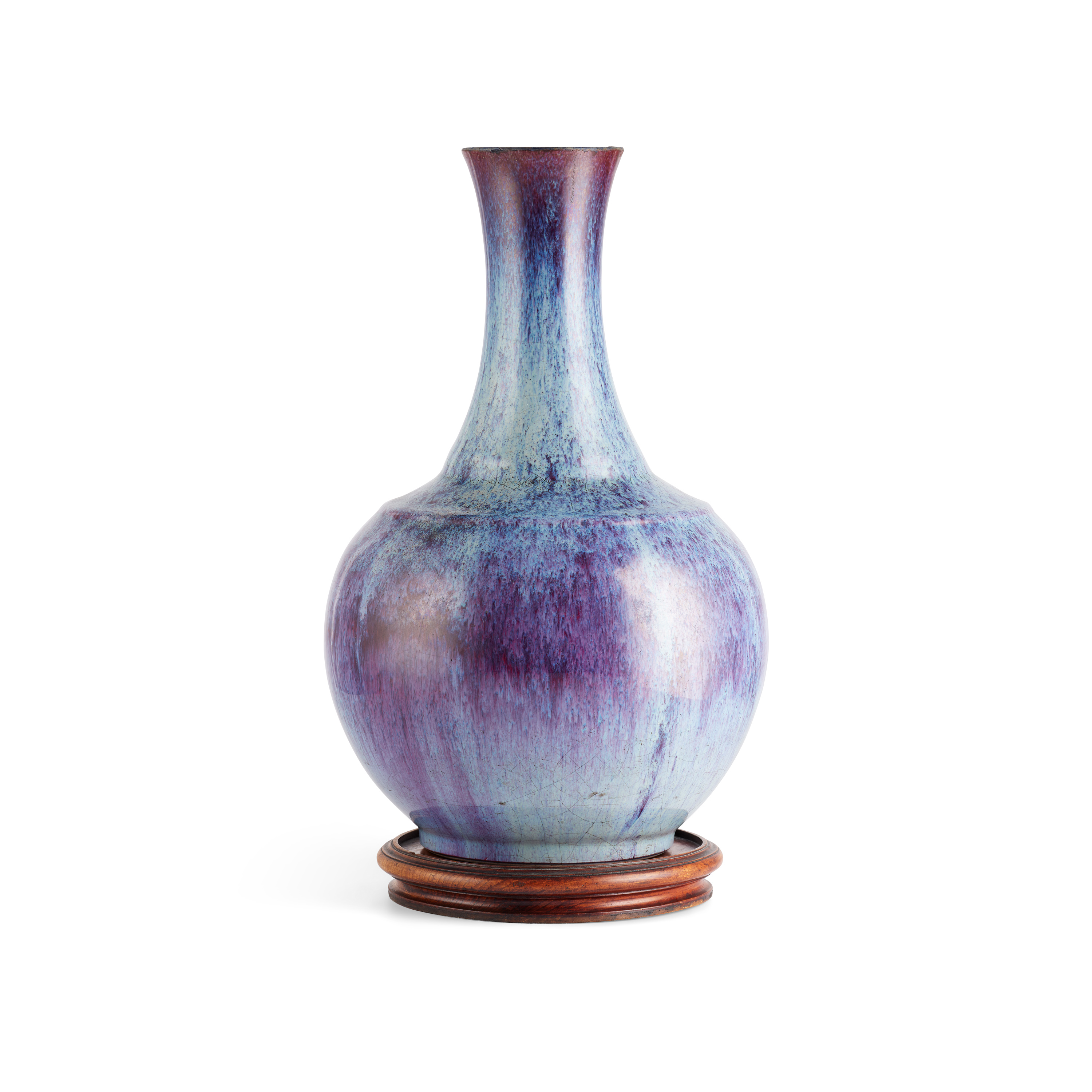 sturdily potted with globular body on short straight foot, raising to waisted long neck and flaring mouth, the shoulder with a raised, covered overall save for the foot rim with a thick lavender glaze suffused with blue streaks, on a carved wooden stand