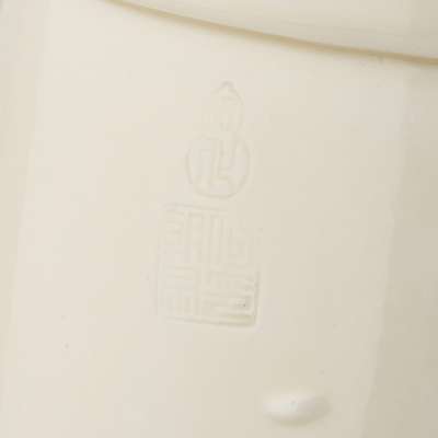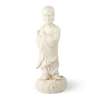 the Bodhidharma moulded standing barefoot on a reed above swirling waves, his left hand clasped beneath the voluminous folds of his right sleeve, right hand raised before his chest holding a woven slipper, his head flanked by heavy earlobes, hair, eyebrows and beard upcurled, eyes intensely looked to upper left, all covered in a creamy white glaze, his back impressed with a ‘Dehua’ two-character mark within a double gourd and a ‘He Chaozong yin’ four-character seal mark