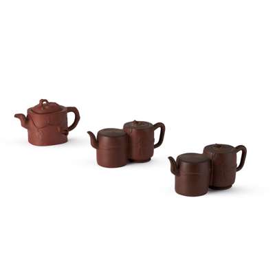 GROUP OF THREE YIXING STONEWARE TEAPOTS