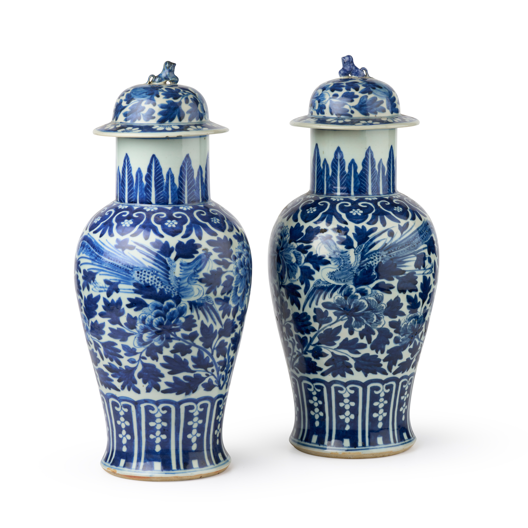 [PRIVATE SCOTTISH COLLECTION, NORTH BERWICK] PAIR OF BLUE AND WHITE BALUSTER VASES WITH COVERS