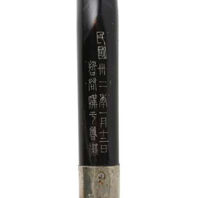 the long stick inlaid in silver with various fonts of shou character- longevity, the dark wood handle further inlaid in silver with inscriptions dated to 12th January 1943