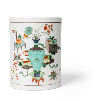 五彩博古圖及鯉魚圖筆筒