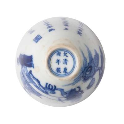 the exterior of the cup finely painted with Zhang Xu, a Chinese calligrapher and poet of the Tang dynasty, writing in front of an officer and his attendant, with an associated poem, the base inscribed with a six-character Kangxi mark in underglaze blue