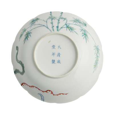 with foliated mouth rim, the interior painted with a phoenix spreading wings under bamboo groves, the exterior further decorated with the tail of the phoenix and bamboo, the base inscribed with a six-character Xianfeng mark in underglaze blue