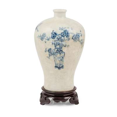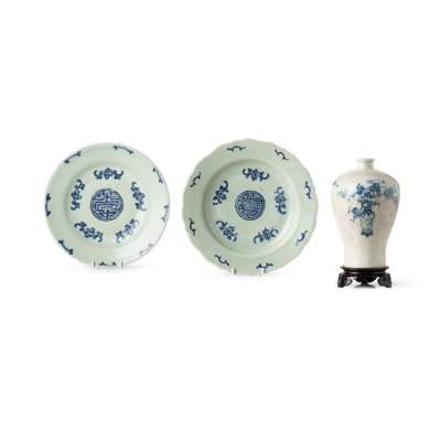 comprising: a crackle-ground meiping vase, sturdily potted, painted on one side with an arrangement of prunus in an antique vase attracting a butterfly, all on a fine russet and white network, on a wooden stand; and two celadon-ground plates, each decorated with a shou roundel in the centre enclosed by five stylised bats, one base inscribed with a four-character Chenghua mark, and the other a six-character Qianlong mark (3)