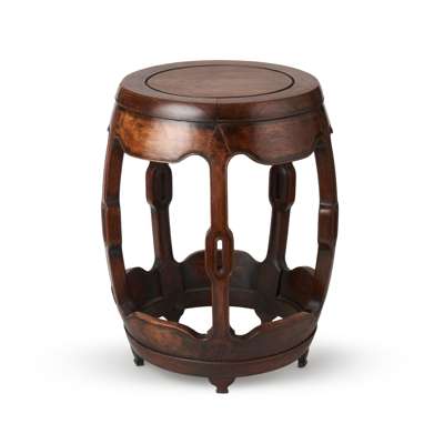 of barrel shape, five curved legs with oval openings that join the top to the base ring raised on five low feet