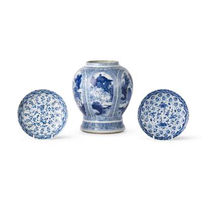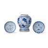 comprising: a baluster vase moulded with raised petal panels painted with auspicious animals, the base with a floral mark within a double-circle; and a pair of moulded ‘floral’ dishes (3)