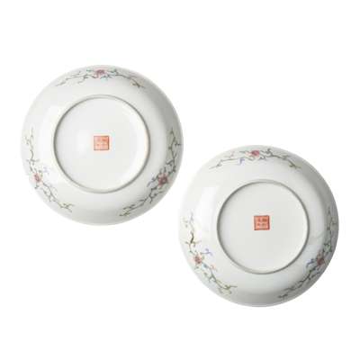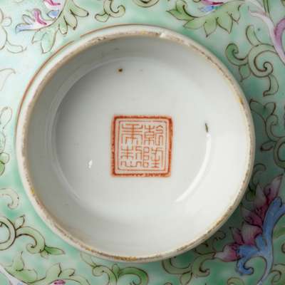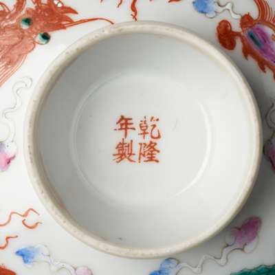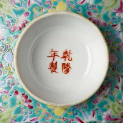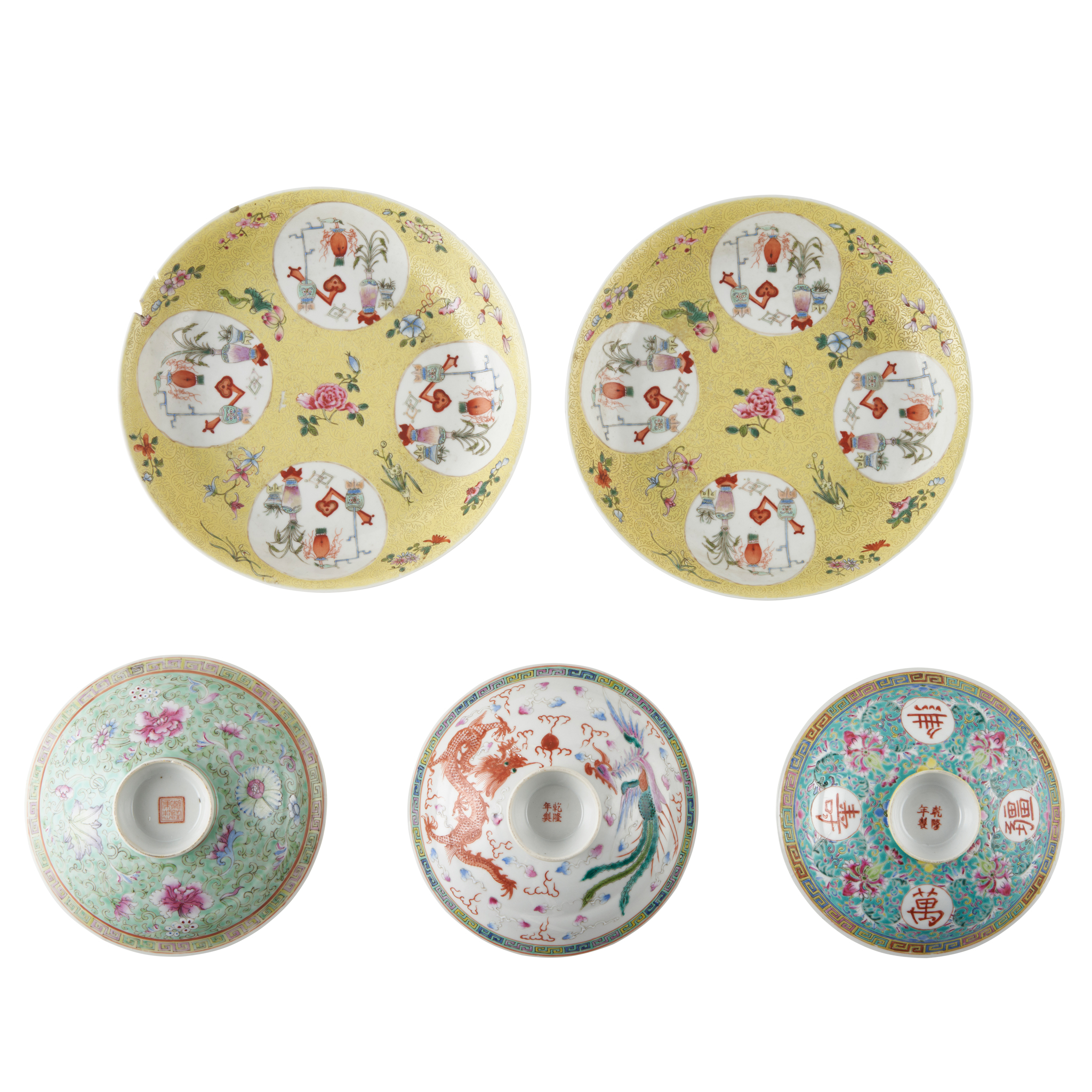 十九至二十世紀 康熙款 粉彩黃地軋道博古紋對盤 及 乾隆款 各式粉彩碗蓋(共五件)