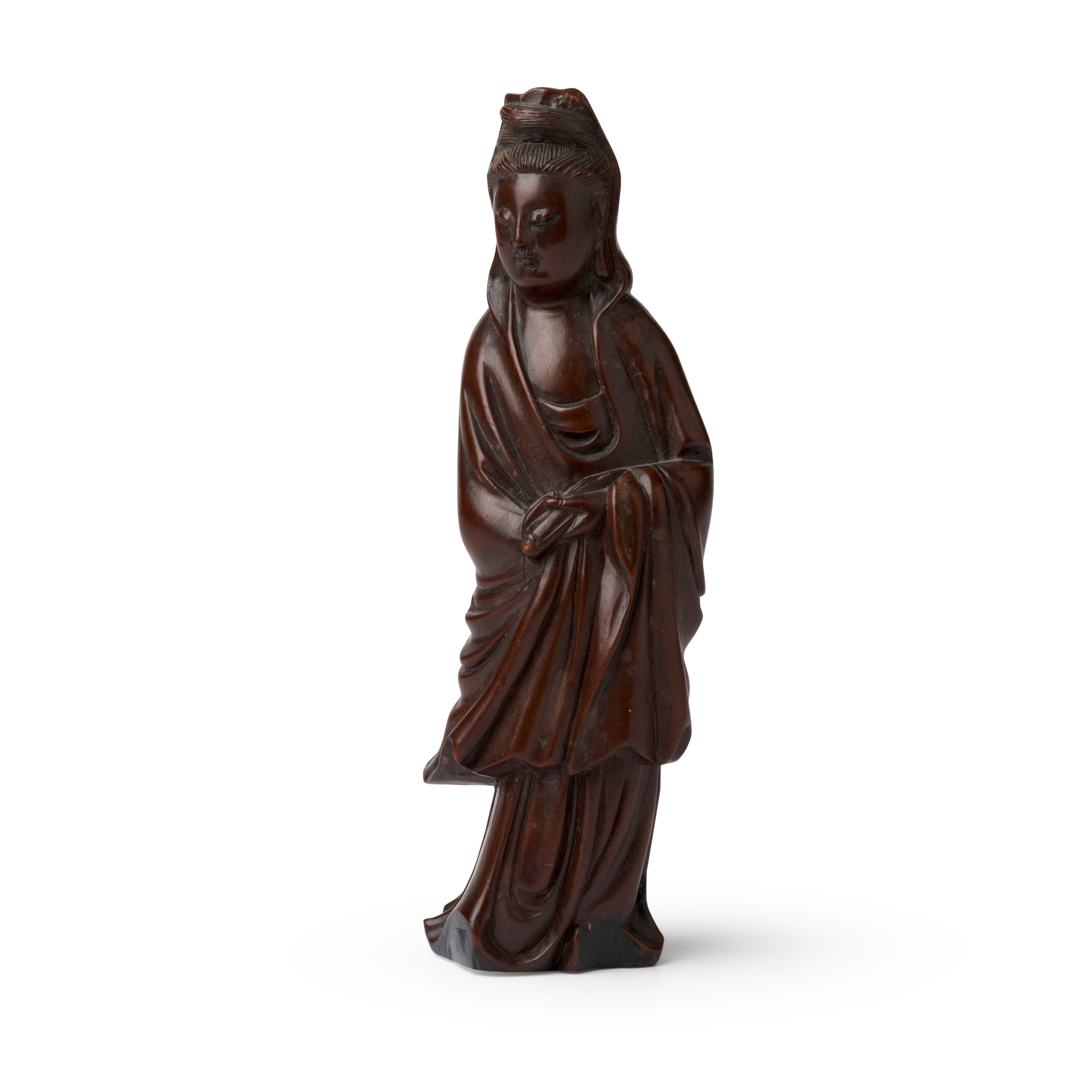 standing with head turned slightly to the right, wearing a long robe windswept to the right, left hand holding a scroll