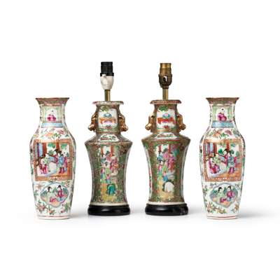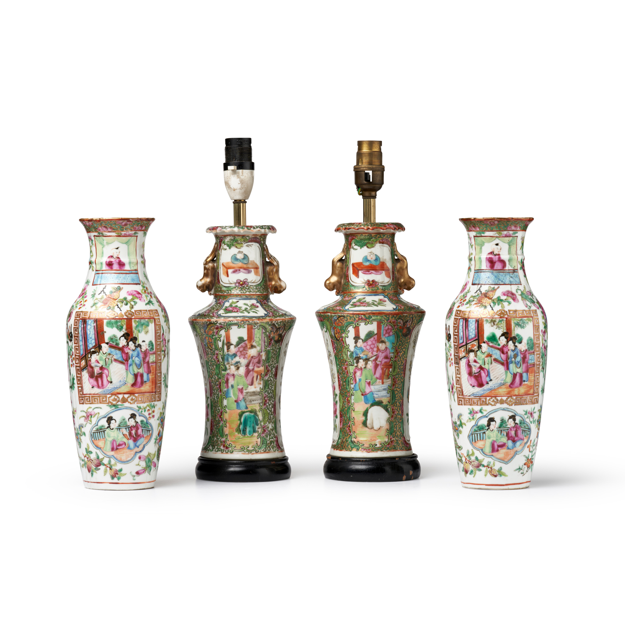 TWO PAIRS OF CANTON FAMIILE ROSE VASES