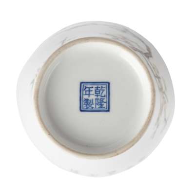 the finely potted vase painted on the exterior with a large plum tree with blossoming flowers, the reverse inscribed with a poem, the base inscribed with a four-character Qianlong mark within a double-square in blue enamel