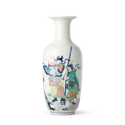the body painted on one side with three characters from the Chinese classical novel Water Margin, including Ruan Xiao'er, Song Qing and Hun Jianlong, the reverse decorated with two flower pots, the base inscribed with a double circle in underglaze blue