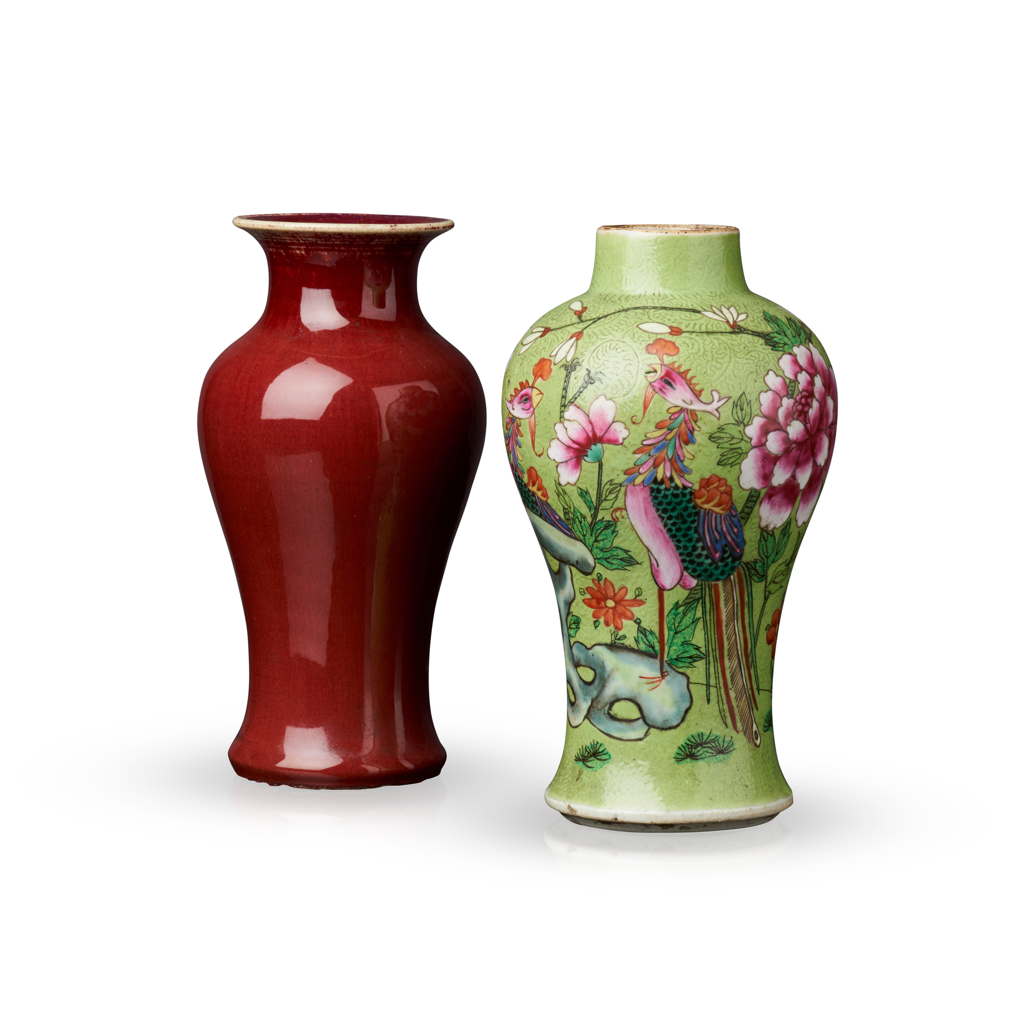 comprising: a lime-green ground ‘sgraffito’ with famille rose ‘phoenixes’ vase; and a baluster vase covered overall save for the base with sang de boeuf glaze (2)