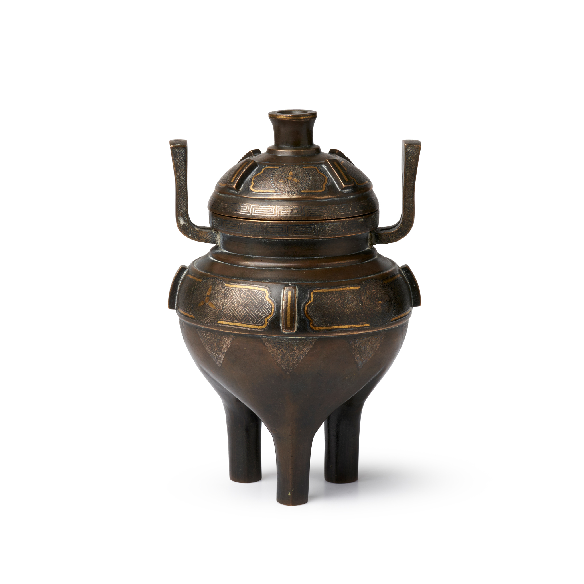 [PRIVATE SCOTTISH COLLECTION, RENFREWSHIRE] INLAID BRONZE TRIPOD KORO AND COVER