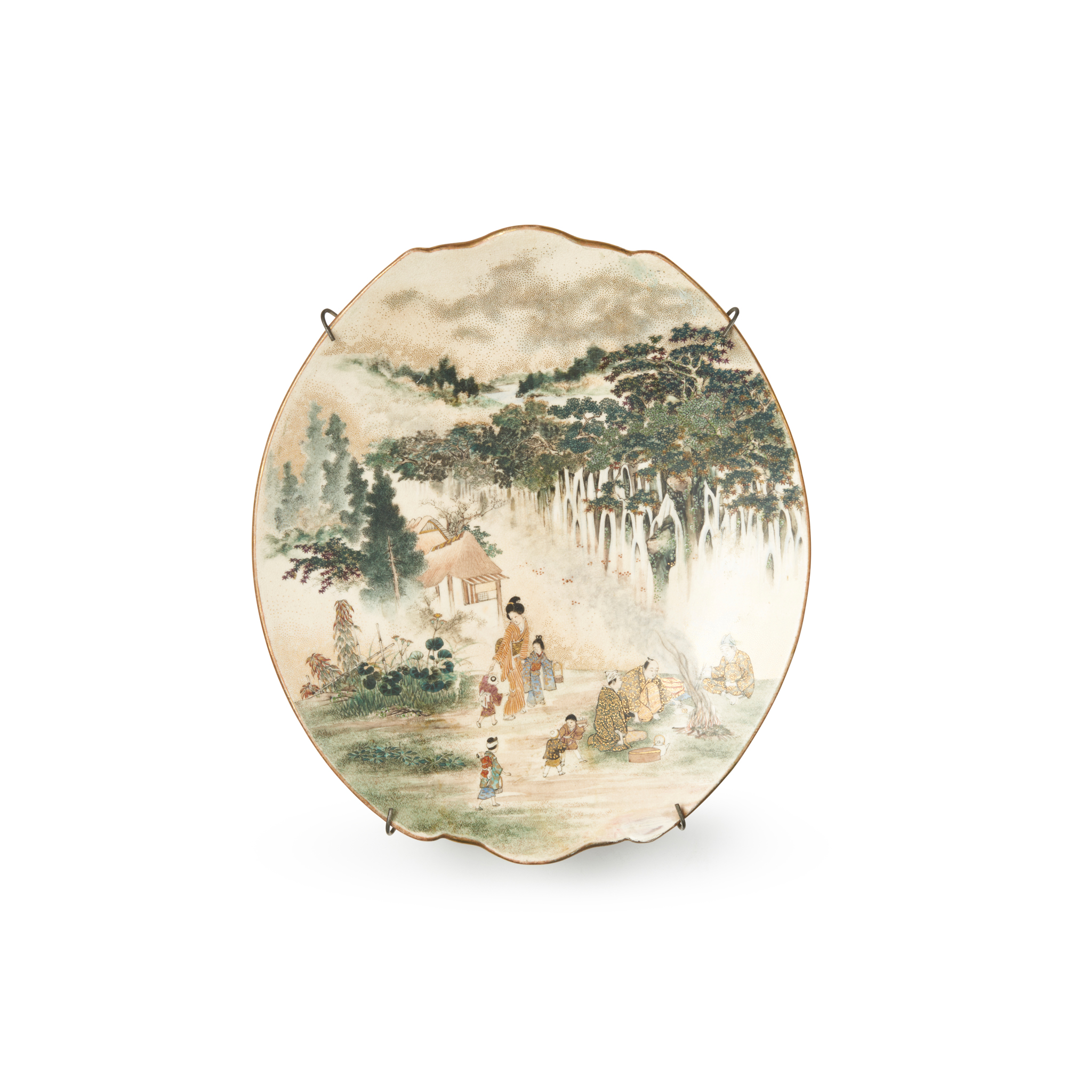 of oval form with shorter sides undulating, the shallow interior painted with a group of adult figures surrounding a bonfire and children at play in a scenic surrounding, the base marked ‘Kyōto tōjiki gōshigaisha zō’, ‘Kazan’