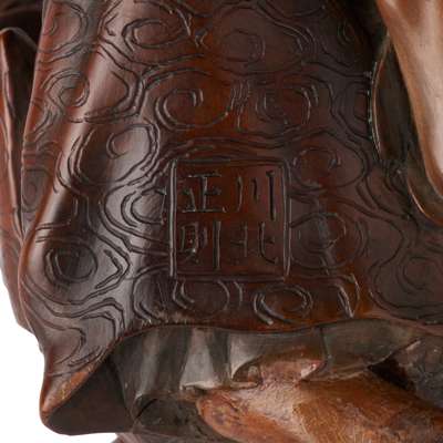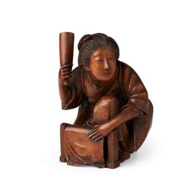 A comparable boxwood figure of a seated man, by Masanori, Meiji, late 19th/early 20th century, note the demure of the face and details of the hair, was sold at Bonhams London, 5 November 2020, lot 122; Also see a netsuke in the form of a man making a mat, also by the same artist, is in Ashmolean Museum, accession no. EA1956.1729.