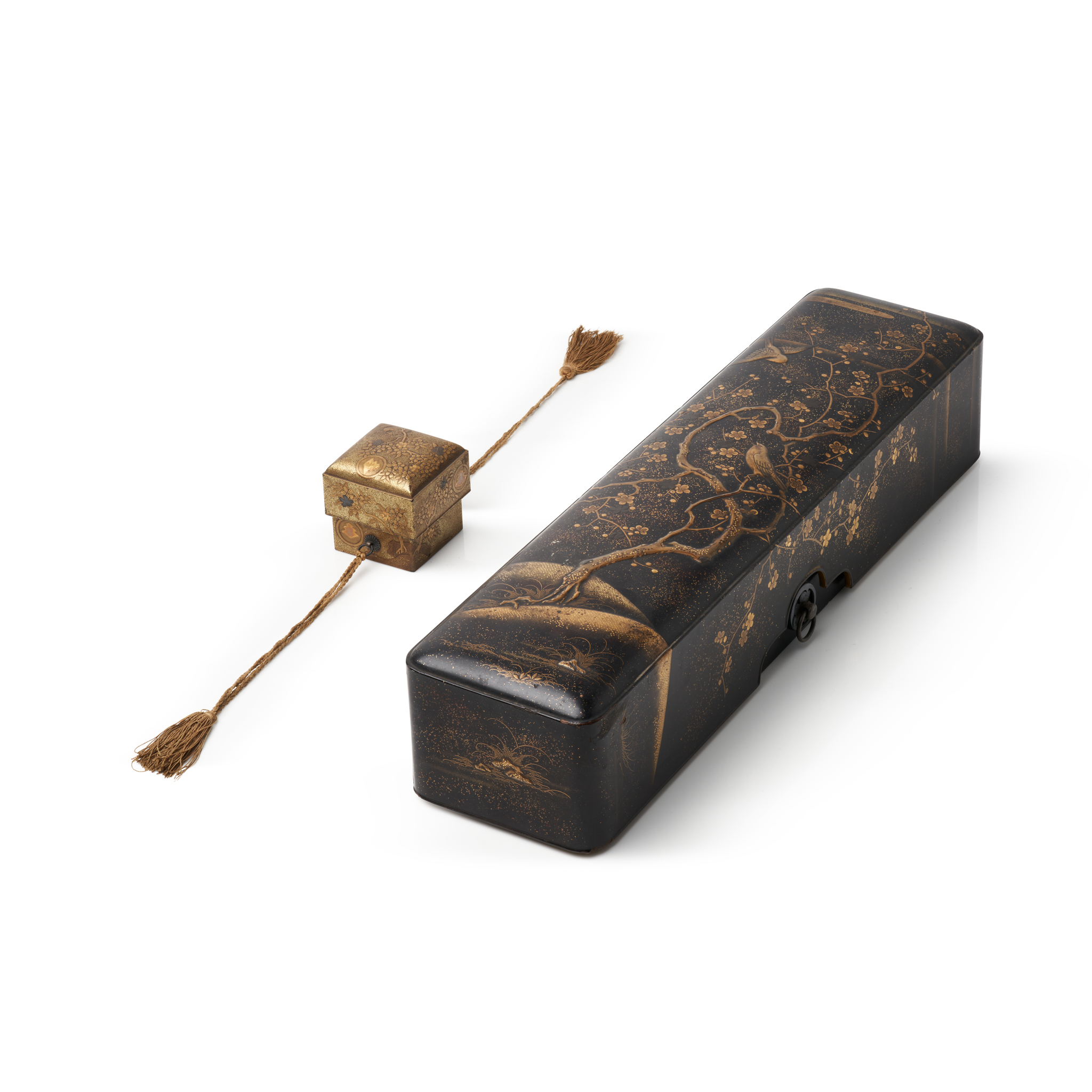 comprising: a black-lacquer rounded rectangular fubako, letter box, the lid decorated with flowering prunus with two birds; and a small gold-lacquer square box with slightly rounded cover, decorated with flowering trees (2)