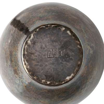 both with tsuchime finish, the tea caddy with an inner lid with bamboo finial, the base marked ‘Shoeido’ in a square panel and stamped jungin (real silver); the base of the base similarly marked in an oval panel and stamped jungin, with an original tamobako (2)