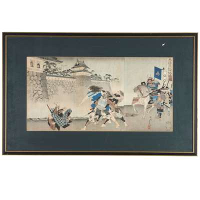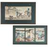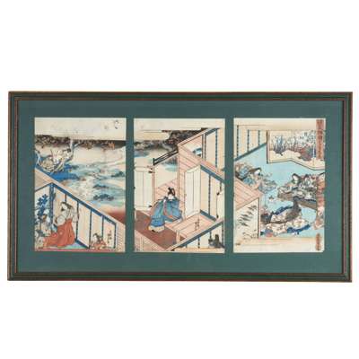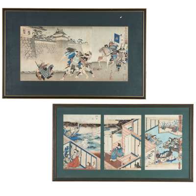 comprising: Torii Suneemon at Nagashino Castle, by Toyohara Chikanobu (1838-1912), dated Meiji 26 (1893), 34.5cm x 69cm; and Genji Monogatari: Hahakigi, by Utagawa Kunisada (1786-1864), 34.5cm x 23.7cm each; in two frames (6)