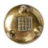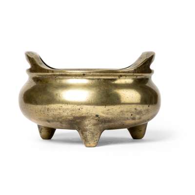 of compressed bulbous form supported on three short tapering feet, flanked by a pair of handles on the rim, the base cast with a sixteen-character mark reading 'Daming Xuande wunian jiandu gongbu guanchen Wu Bangzuo zao (Made for the Board of Works under the Supervision of Wu Bangzuo in the Fifth Year of Xuande)' in a recessed square panel