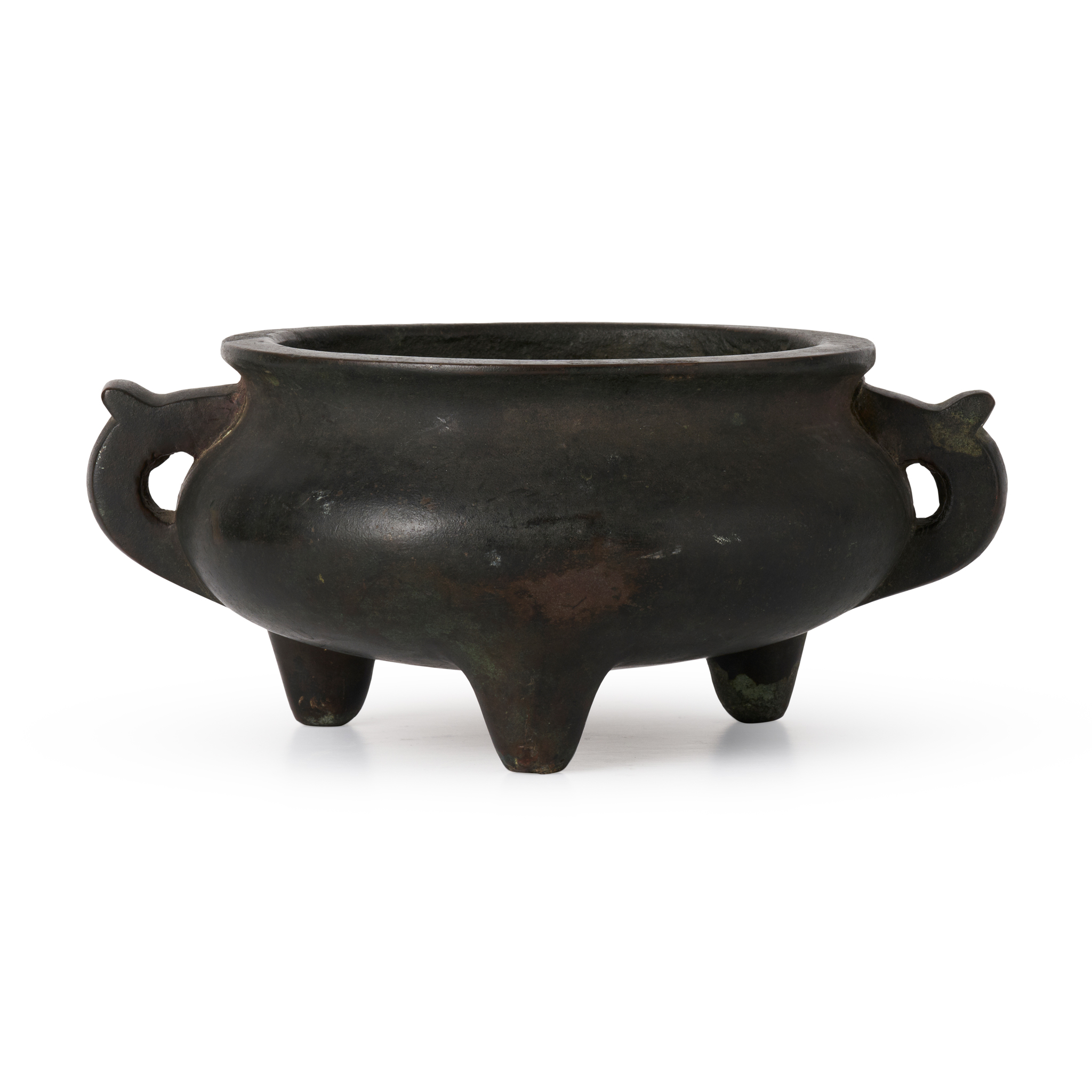 sturdily potted on three conical feet, the compressed globular body flanked with two looped handles, the base cast with a six-character ‘Da Ming Xuan De Wu Nian’ mark in a recessed square panel