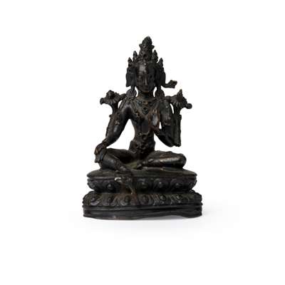 cast seated in royal ease pose with right foot resting on a smaller lotus issuing from the throne, right hand resting on the right knee, left hand raising before chest in vitarka mudra, both hands pinching a lotus stem, the down cast eyes underneath a five-leaf crown and flanked by a pair of large pendulous earrings