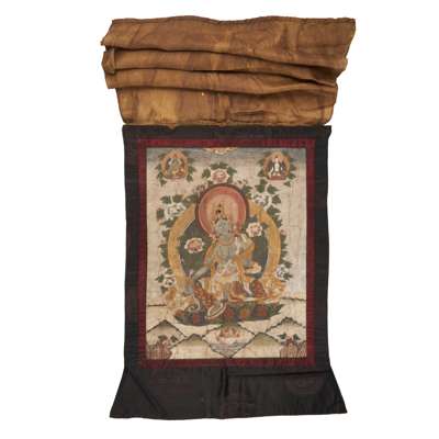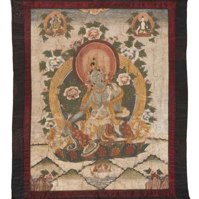 the savioress seated in lalitasana on a lotus throne, each hand holding a lithe lotus stem