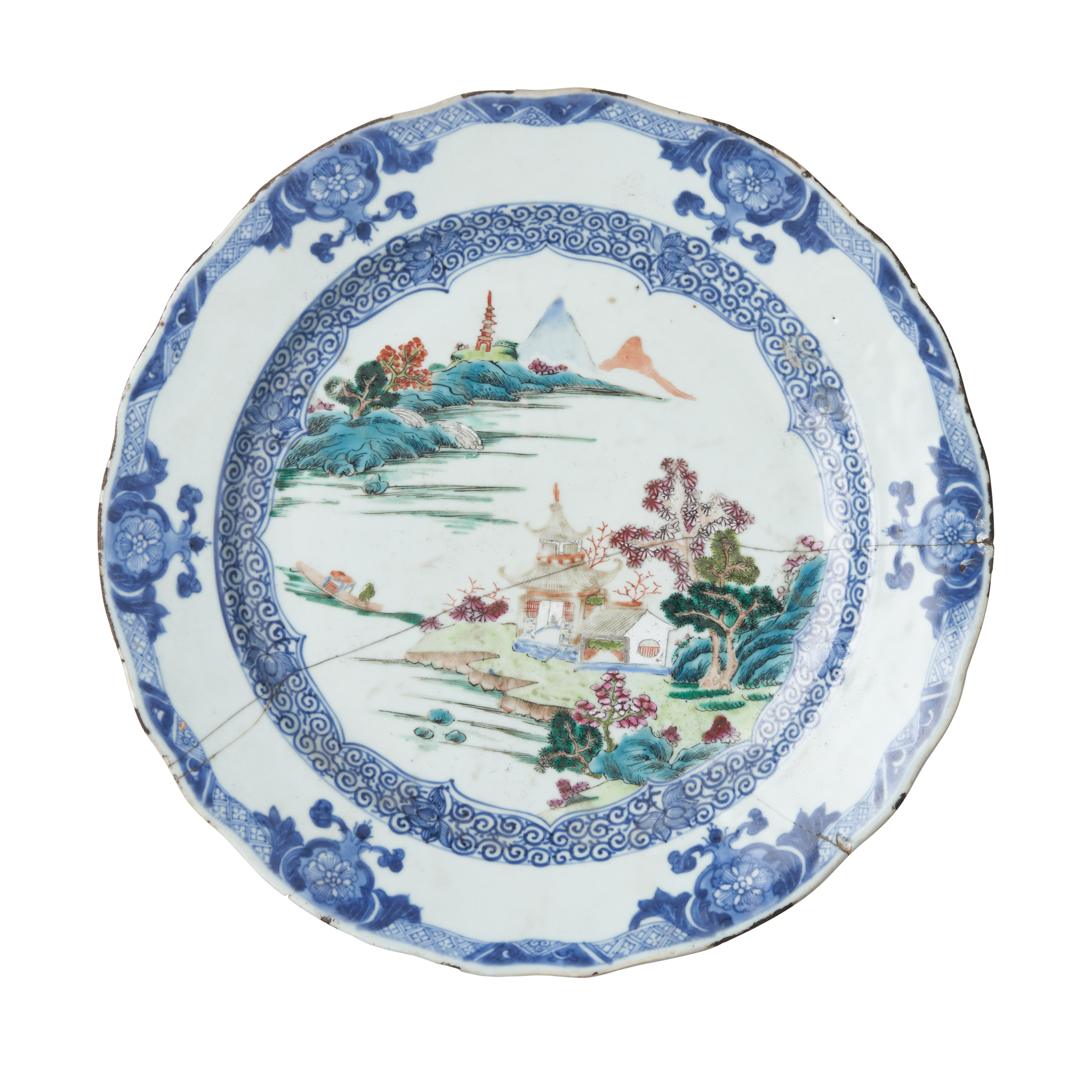 [FROM THE ESTATE OF THE LATE ROBERT BOGDAN] BLUE AND WHITE WITH FAMILLE ROSE 'LANDSCAPE' CHARGER