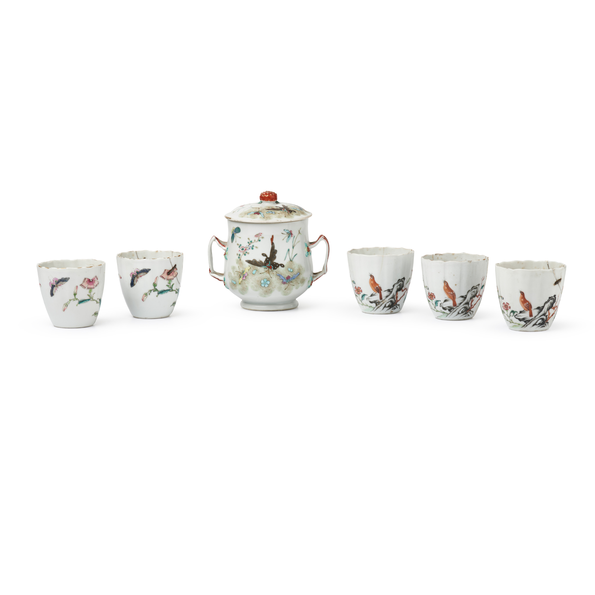 comprising: a set of five lobed cups painted with flowers and birds, and a lidded jar set with two interlocking handles, painted with butterflies and flowers, the base inscribed with a six-character Tongzhi mark within two square panels (6)