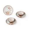 comprising: two cups and three saucers, all similarly decorated with birds and flowers in the interior, the exterior covered with brown glaze (5)