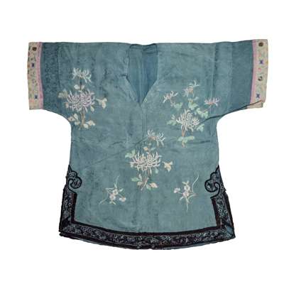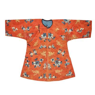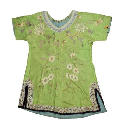 the child's robe of red ground, decorated with butterflies and flowers; the other two, one of sky blue, one of lime green ground blouses altered from older lady's robes (3)