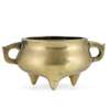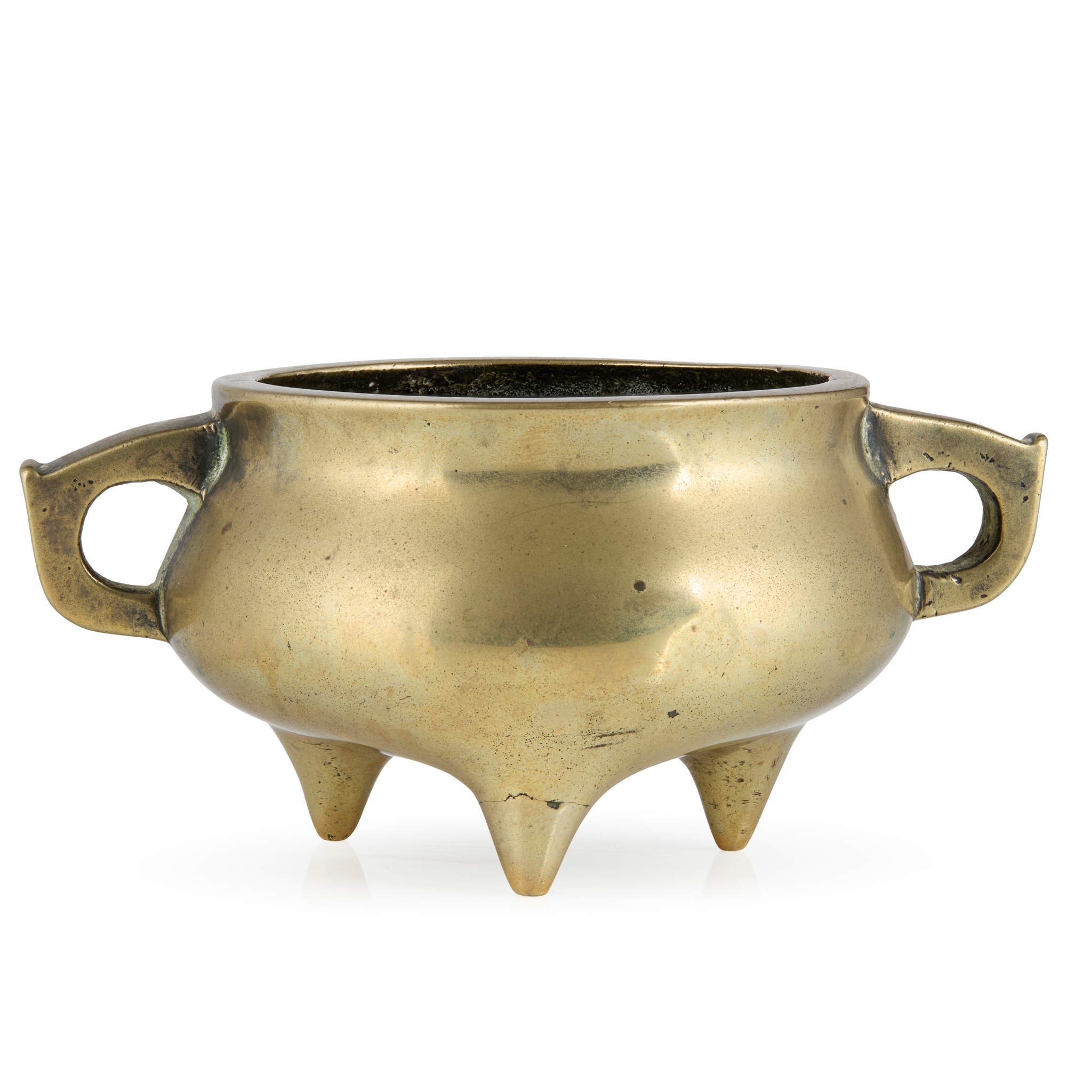 of compressed globular form rising from three short conical feet to a slightly flaring mouth, set at the shoulder with a pair of loop handles, the base with a two-character Xuande mark in a recessed panel