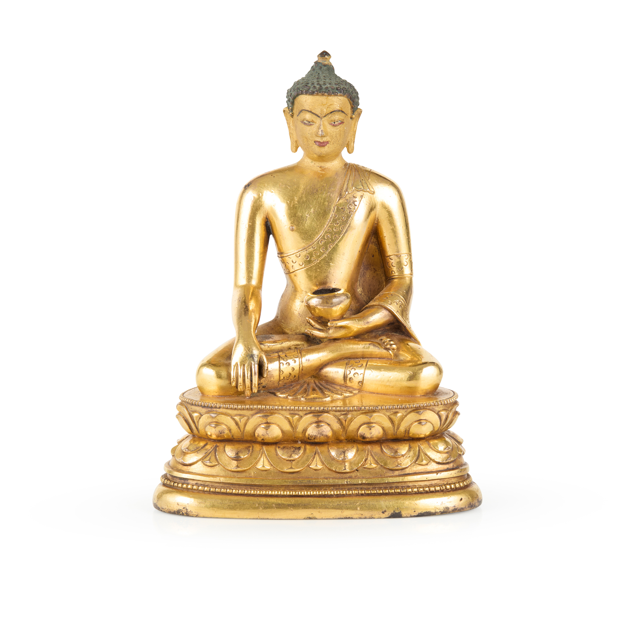 Compare to a gilt bronze figure of the Medicine Buddha, Zanabazar School, 18th century, also with gold painted face, sold at Christie's New York, 21 Mar 2008, lot 643; Also see a gilt-copper-alloy figure of Buddha Shakyamuni, holding the same mudras with this present lot, similarly dated, sold at Bonhams Hong Kong, 28 May 2019, lot 141.