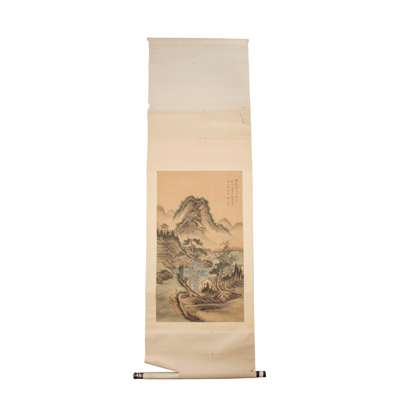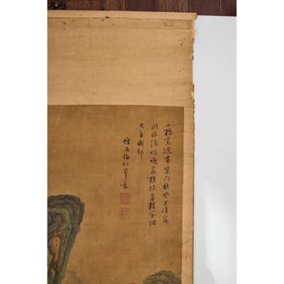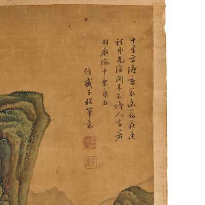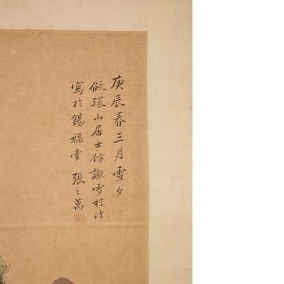 楊晉款 山水圖兩幅款識: (其一)仿文伯仁筆意;(另一)仿盛子昭筆意鈐印: 楊晉、子鶴張之萬款 山水圖款識: 庚辰春三月雪夕,儗環山居士仿謝雪村法,寫於錫福堂,張之萬鈐印: 臣張之萬two ink and watercolour on silk, both inscribed with poems upper right, sealed ‘Yang Jin’ and ‘Zi He’; and an ink and watercolour on paper, dated to the Geng Chen year in March spring, signed and sealed ‘Zhang Zhiwan’, all mounted as scrolls (3)