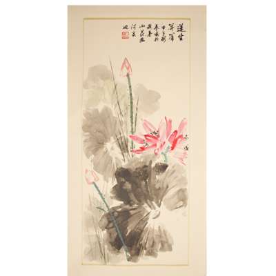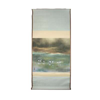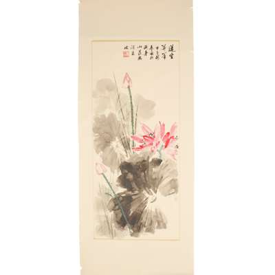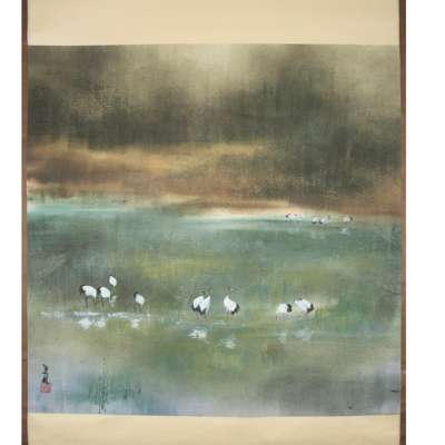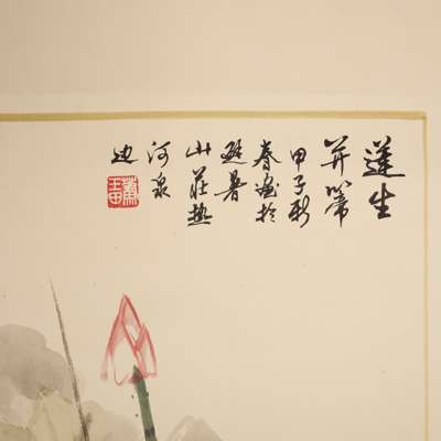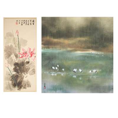 鶴圖款識: 付希林鈐印: 付希林《蓮生並蒂》款識: 蓮生並蒂,甲子新春畫於避暑山莊熱河泉邊鈐印: 蕭王田ink and colour on paper, sign and seal of the artist ‘Fu Xilin’, mounted as a scroll; ink and watercolour on paper, inscribed upper right, dated to the Jia Zi year, sealed ‘Xiao Wangtian’ (2)