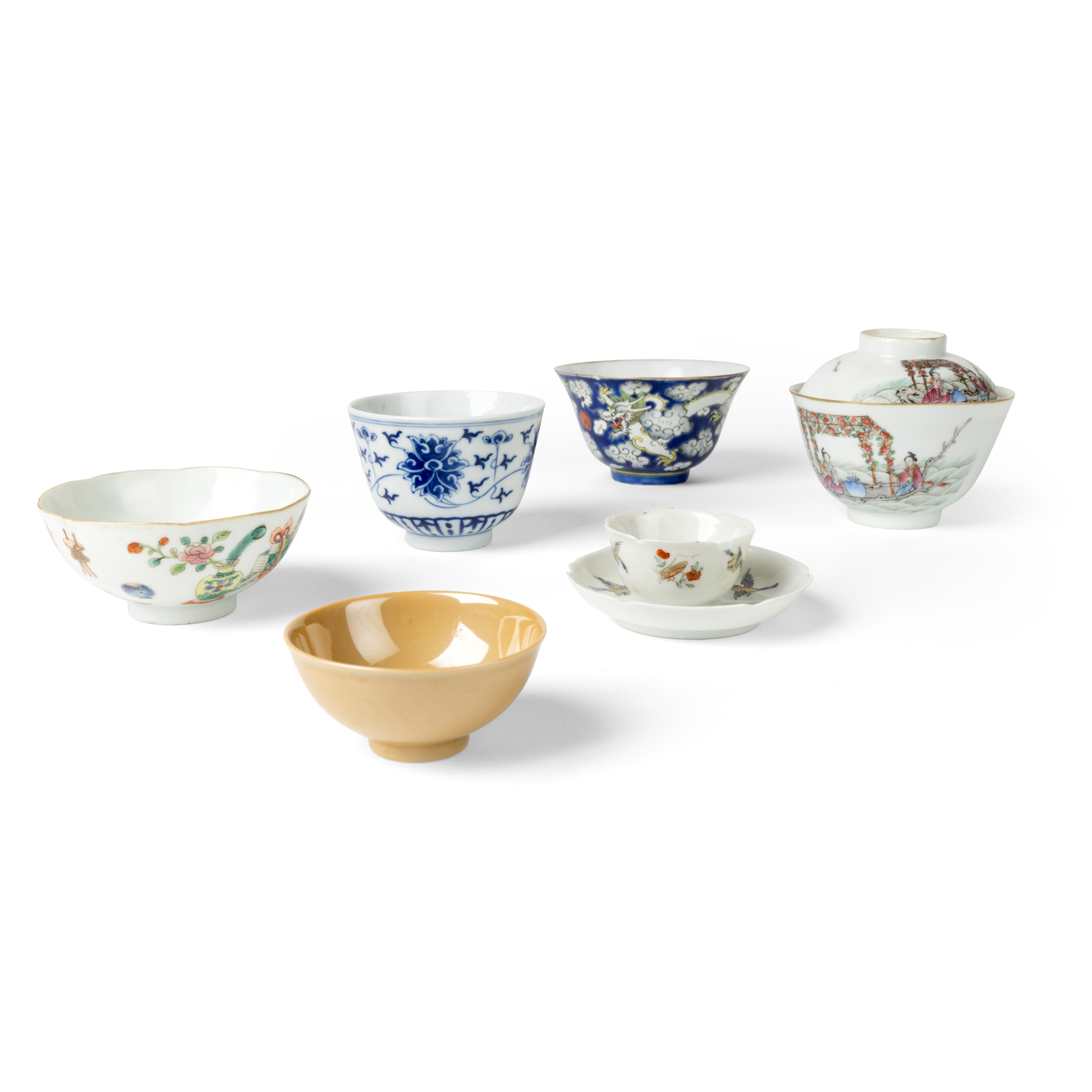 comprising: one small famille rose foliate cup painted with insects and birds, together with a matching saucer; one cafe-au-lait cup incised with stylised tendril pattern on the exterior, and base inscribed with a character ‘Song’ within double-circle in underglaze blue; one blue and white ‘lotus’ cup, the base inscribed with a six-character Guangxu mark; one famille rose ‘antiquities’ cup, the base inscribed with a four-character mark in iron-red; one blue-ground multi-colour enamelled ‘dragon’ cup, the base inscribed with a Daoguang mark in a square; and one famille rose covered cup, finely painted with two ladies taking a boat to a celestial palace with a crane in flight (7)