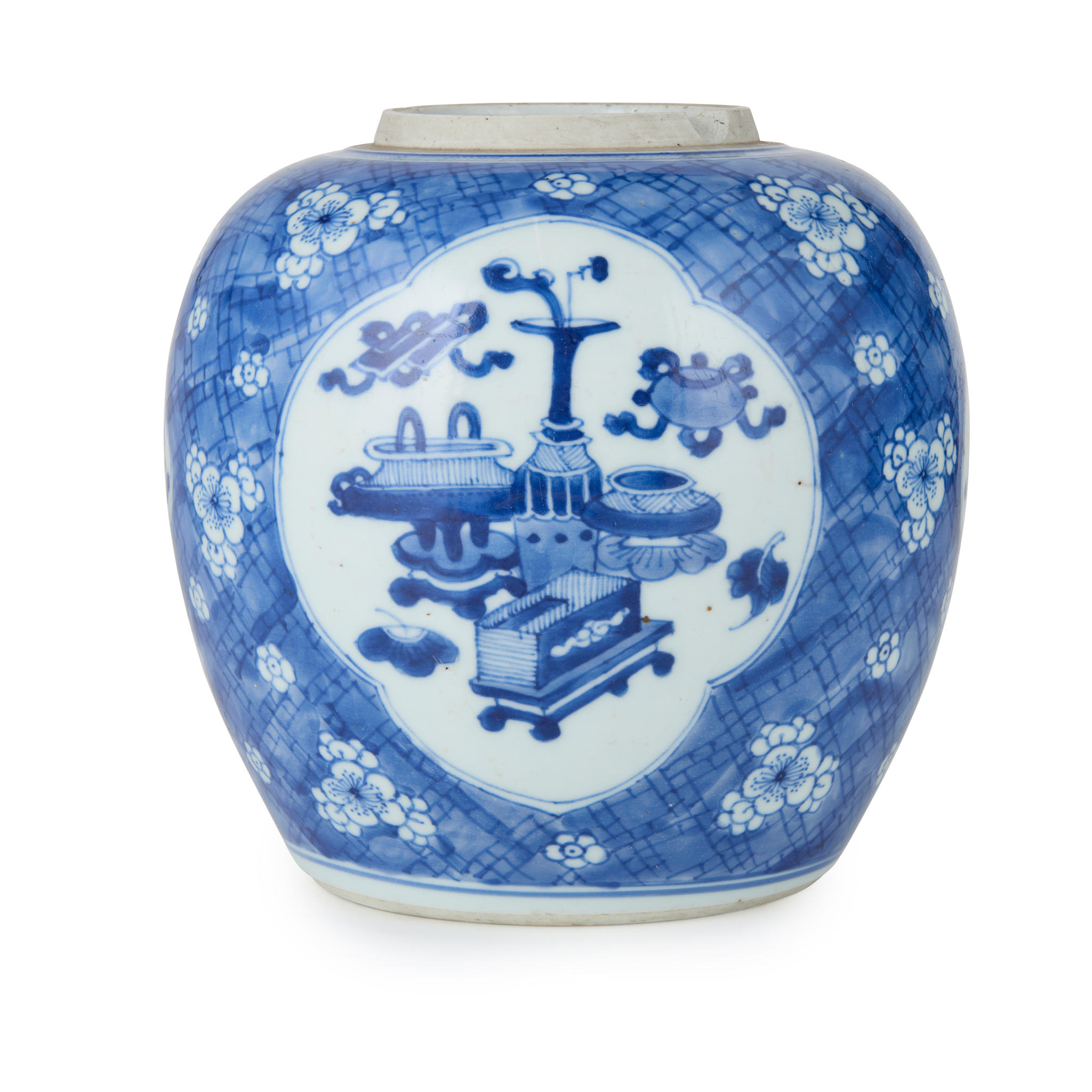 painted with ‘one hundred antiquities’ motif in two main cartouches alternating with auspicious emblems against a ‘cracked ice and prunus’ ground