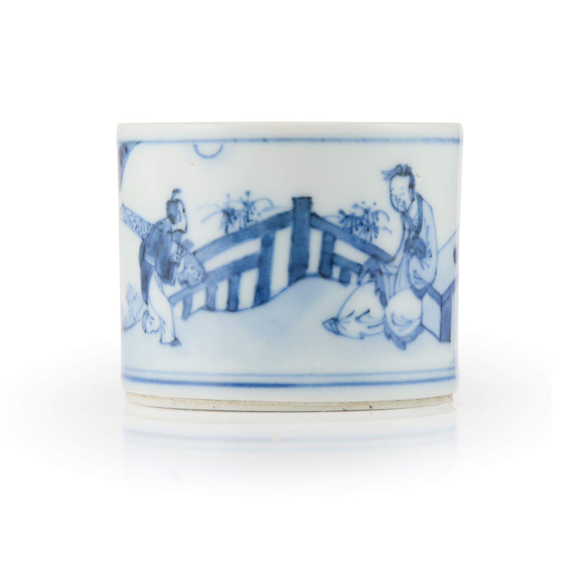 of cylindrical form, finely painted with a literati leaning against a long desk, looking at his attendant carrying a qin musical instrument towards him, all set in a fenced garden setting, the base inscribed with a six-character Jiajing mark in underglaze blue