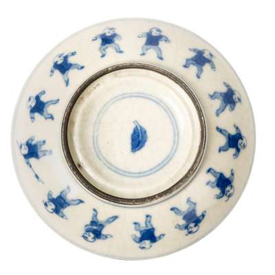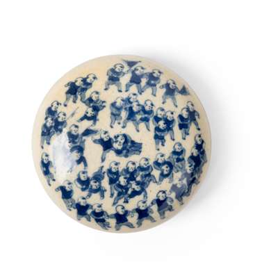 the domed cover and the exterior of the box finely painted with various boys at play, all against a ge-type crackled glaze ground, the base further painted with a leaf motif in underglaze blue