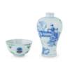one blue and white meiping vase painted with two ladies and one attendant in a garden setting; the other doucai bowl with ruyi-head cloud, the base inscribed with a six-character Yongzheng mark within a double-square (2)