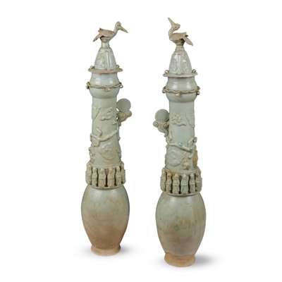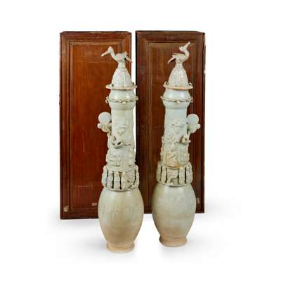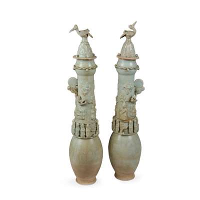 LARGE PAIR OF QINGBAI-GLAZED FUNERARY JARS WITH COVERS