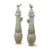each slender pear-shaped vase applied with a border of twelve standing figures and one reclining figure, with a striding dragon around the neck, with further figures and mythical animals, surmounted by a tall domed cover surmounted by a crane or egret finial, with fitted boxes (2)